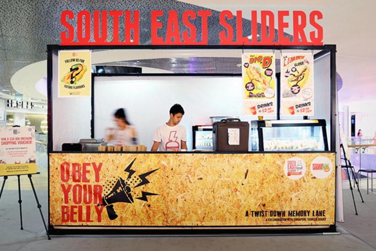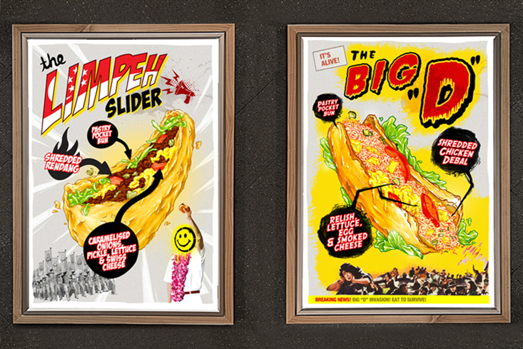 Brand identity and space design for South East Sliders. Taking a radical twist on local flavours, re-made into sliders, you get South East Sliders – the modern day food mavericks of a ‘New World Order’. Using this aspect as our brand pillar, we created a branding on a youthful pop-culture attitude – always tasty yet defining and unconventional. Drawing inspirations from propaganda and modern day political satire to quirky puns of current social stigmas, the brand character was synonymous with the food itself.